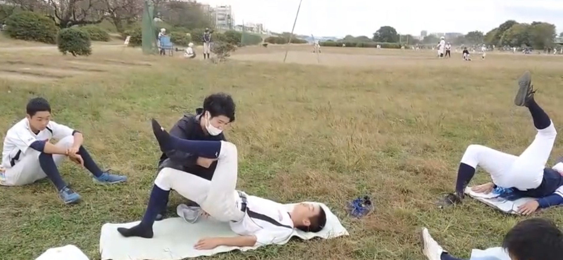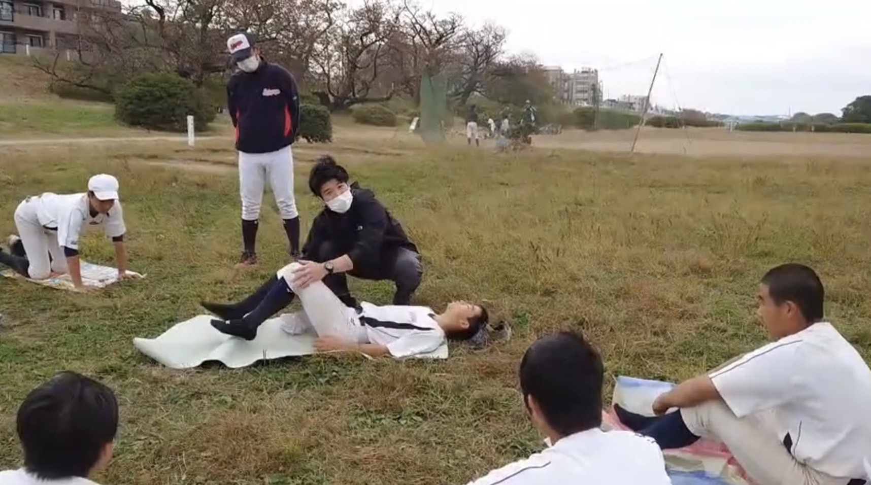2022/11/13、クリニック理学療法士(PT)齊藤OB(27)がグランドにてストレッチトレーニングや身体のケア方法などについてご指導して下さいました。