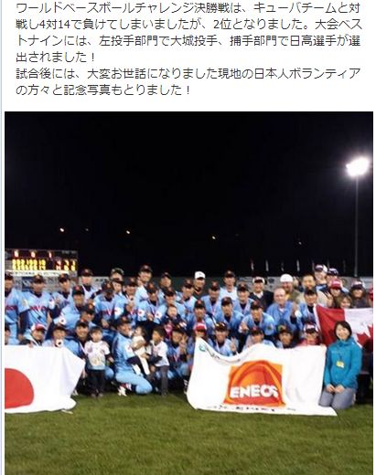 【プリンスジョージ(カナダ)藤倉聡子】野球の国際大会、ワールドベースボールチャレンジ最終日は22日、当地で決勝を行い、日本のJX-ENEOSはキューバにコールド負けし準優勝だった。左腕投手部門で大城、捕手部門で日高が、大会ベストナインに選ばれた。